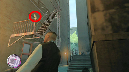 隠れ家のあるブロックのすぐ北のブロック。ケージファイトの入口のすぐ西にある非常階段の手すりの上。