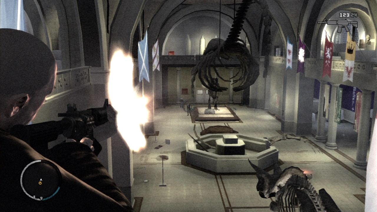 博物館内に数人の敵が現れます。物陰に隠れながら順番に倒していってください。二階の敵を倒したら一階に降りますが、そのまえに一階の敵をできるだけ倒しておきましょう。