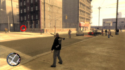 島の北西部分にあるプール(楕円形の歩道がある)のすぐ東にあるブロック(住宅が並んでいる)に注目する。それぞれの住宅と住宅の間は通路となっているが、そのうち一番南にある通路の途中の壁の上。