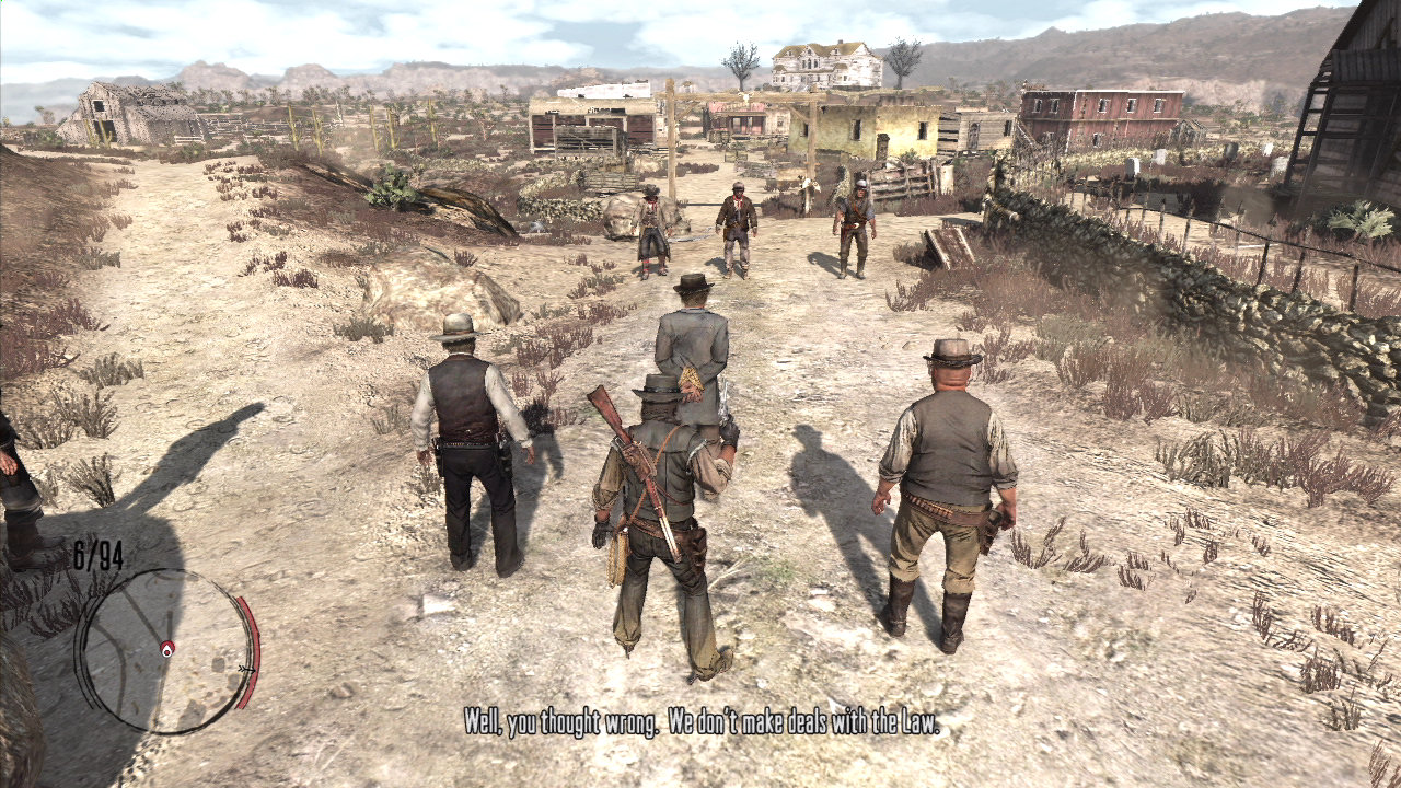 ここから銃撃戦が始まります。まずは、正面の3人をDead Eyeで片付けるといいでしょう。その後、敵を倒しつつ街の中心部に進んでください。
